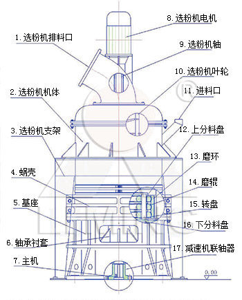 主機(jī)電動(dòng)機(jī)通過(guò)減速機(jī)帶動(dòng)主軸及各層轉(zhuǎn)盤旋轉(zhuǎn),轉(zhuǎn)盤通過(guò)柱銷帶動(dòng)幾十個(gè)環(huán)輥在磨環(huán)滾道內(nèi)滾動(dòng)并旋轉(zhuǎn)。大塊物料經(jīng)破碎機(jī)破碎成小顆粒后由提升機(jī)送入儲(chǔ)料倉(cāng),電磁振動(dòng)給料機(jī)將物料均勻的送到上轉(zhuǎn)盤的中部,物料在離心力的作用下散向圓周邊,并落入磨環(huán)的滾道內(nèi)被環(huán)輥沖壓、滾碾、研磨而粉碎,物料經(jīng)第一層粉碎后又落入第二層及第三層,高壓離心風(fēng)機(jī)的抽吸作用將外部空氣吸入機(jī)內(nèi),并將經(jīng)過(guò)第三層粉碎后的粗粉帶入選粉機(jī)內(nèi)。選粉機(jī)內(nèi)旋轉(zhuǎn)的蝸輪所產(chǎn)生的蝸流使粗顆粒物料回落重磨,細(xì)粉則隨氣流進(jìn)入旋風(fēng)集粉器并由其下部的卸料閥排出即為成品,而帶有少量細(xì)粉塵的氣流則經(jīng)過(guò)脈沖除塵器凈化后通過(guò)風(fēng)機(jī)及消聲器排出。